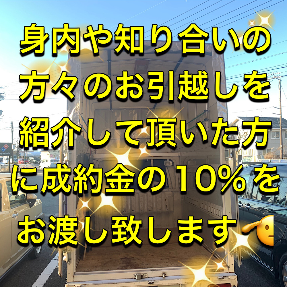 身内や知り合いのお引越しをご紹介してくれた方に成約した時の成約金の10%を紹介料としてお渡しします!
