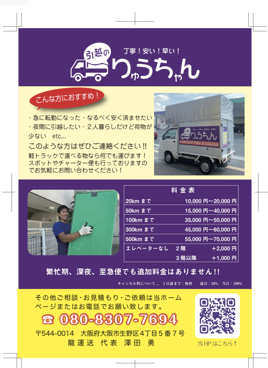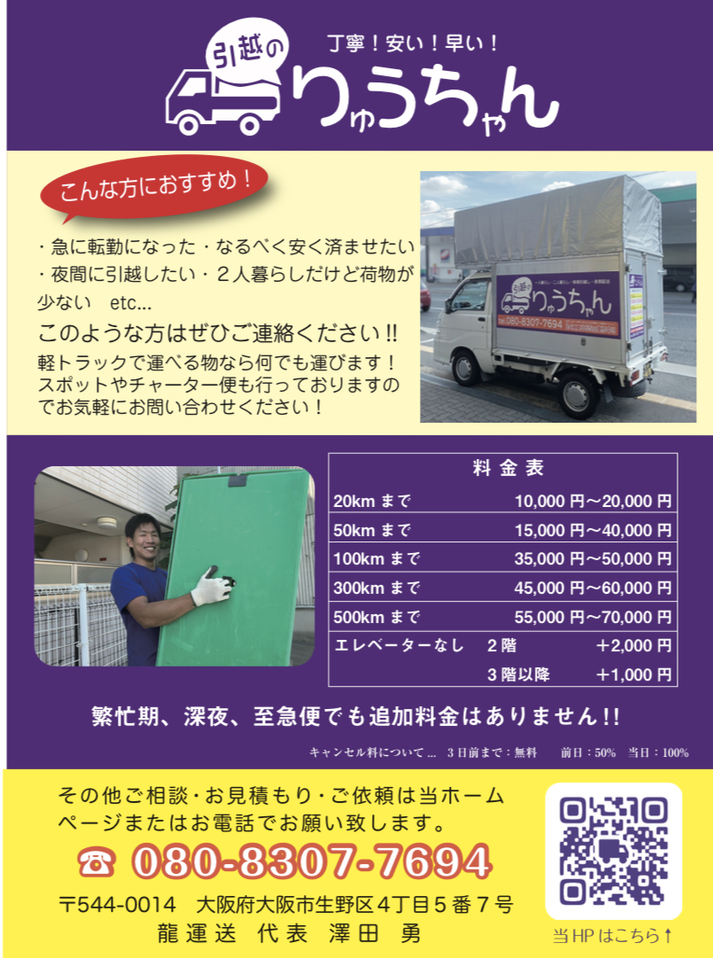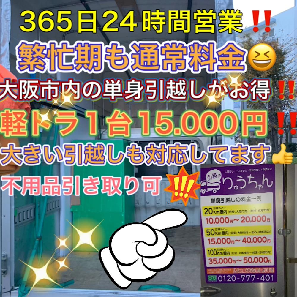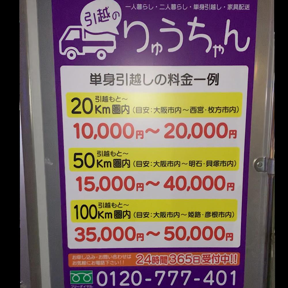 大阪市で一人暮らし、単身引越しのお見積もり、おすすめ業者といえば引越のりゅうちゃんです!